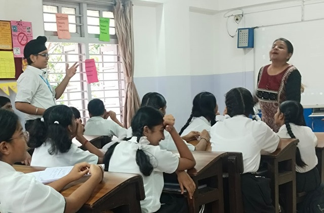 The session for Grade 8 students was based on ‘Expression and Emotional Management’ wherein they answered questions based on Hershey’s Candy bars, Emojis, Angry birds, etc. After hearing audios of different situations, students listed emotions they feel in those situations and then learnt about ACTS- Awareness, Control, Talk and Solve strategy that can be used to respond to emotions.